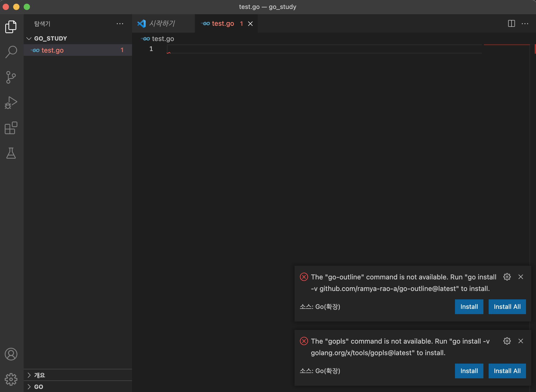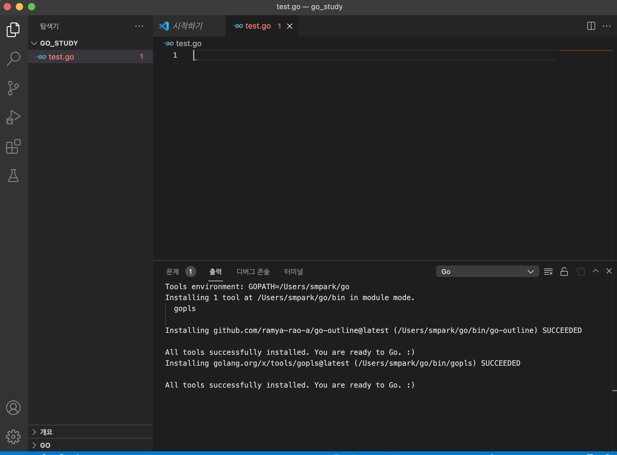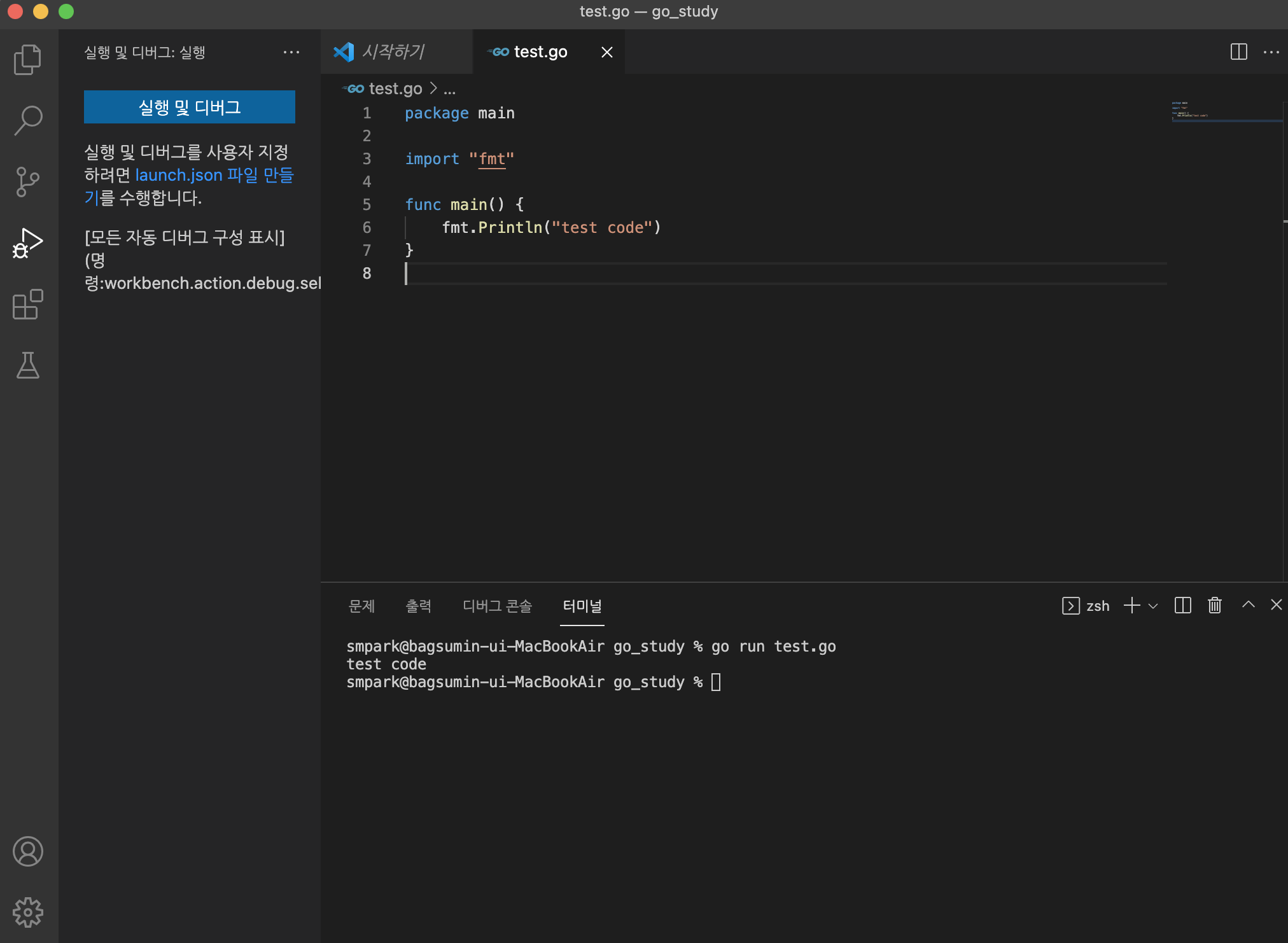 저는 go_study라는 폴더를 만들고, 그 안에 test.go파일을 만들어 주었습니다.