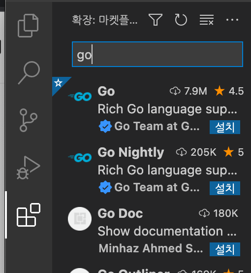 VScode에 확장 아이콘을 누른 후, Go 라고 입력하면 다음과 같은 확장 패키지들이 나오는데, 그 중 가장 위에 있는 Go확장팩을 설치합니다.