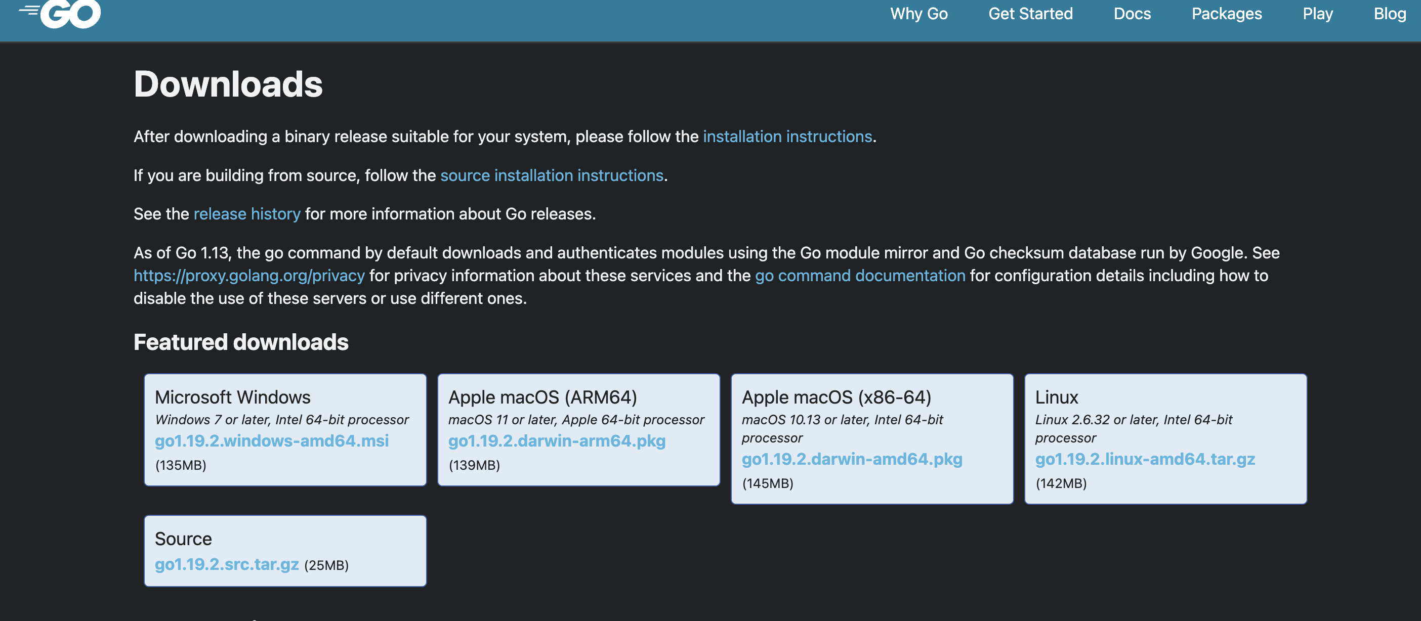 Downloads After downloading a binary release suitable for your system, please follow the installation instructions. If you are building from source, follow the source installation instructions. See the release history for more information about Go releases