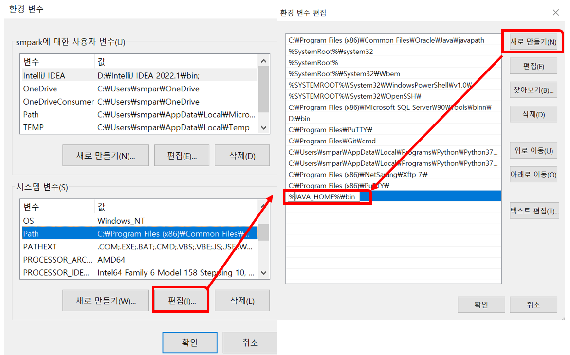 환경 변수 편집 창이 열리면 위 사진과 같이 새로 만들기 버튼을 누르고 %JAVA_HOME%\bin 경로를 입력 후 확인 버튼을 눌러 적용 해 줍니다.