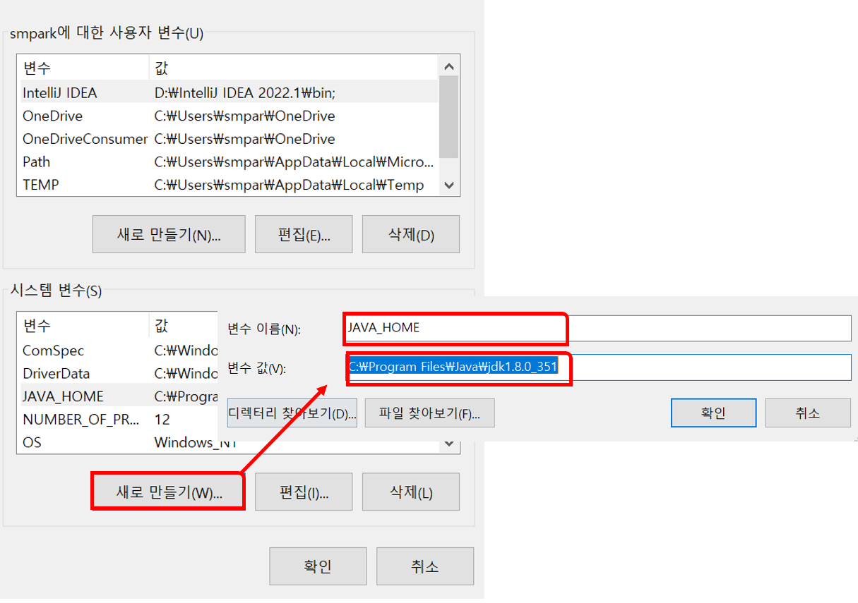 그 때 변수 이름 : JAVA_HOME 변수 값 : 상단에서 확인했던 jdk경로값을 입력 해 주면 됩니다.