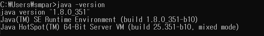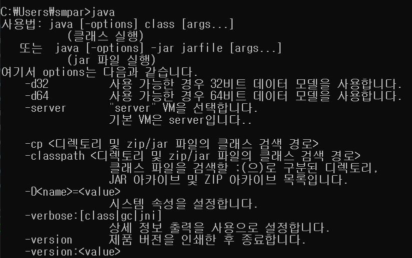 cmd 창을 열어 java -version 커맨드를 입력하면 위와 같이 설치하려는 버전이 출력되는 것을 확인할 수 있습니다.