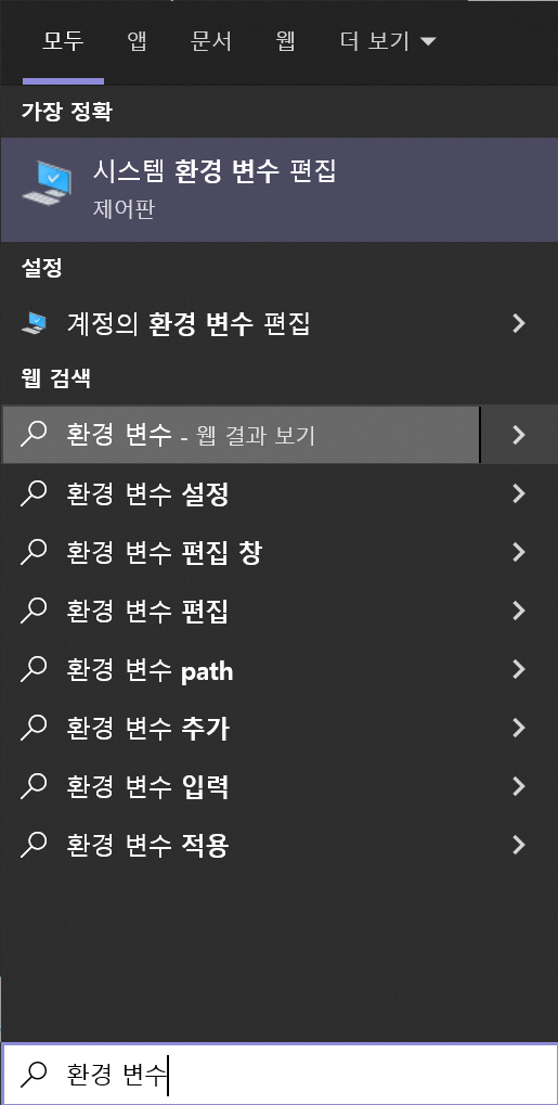 작업표시줄 검색창에 환경 변수라고 입력한 후 시스템 환경 변수 편집으로 들어갑니다.