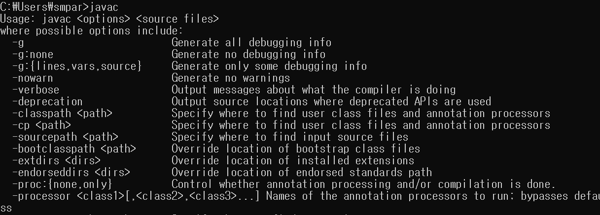 만일 java 커맨드만 실행이 되고, javac 커맨드가 실행이 되지 않는다면 jdk가 아닌 jre 파일을 받은 것 일 수 있으므로