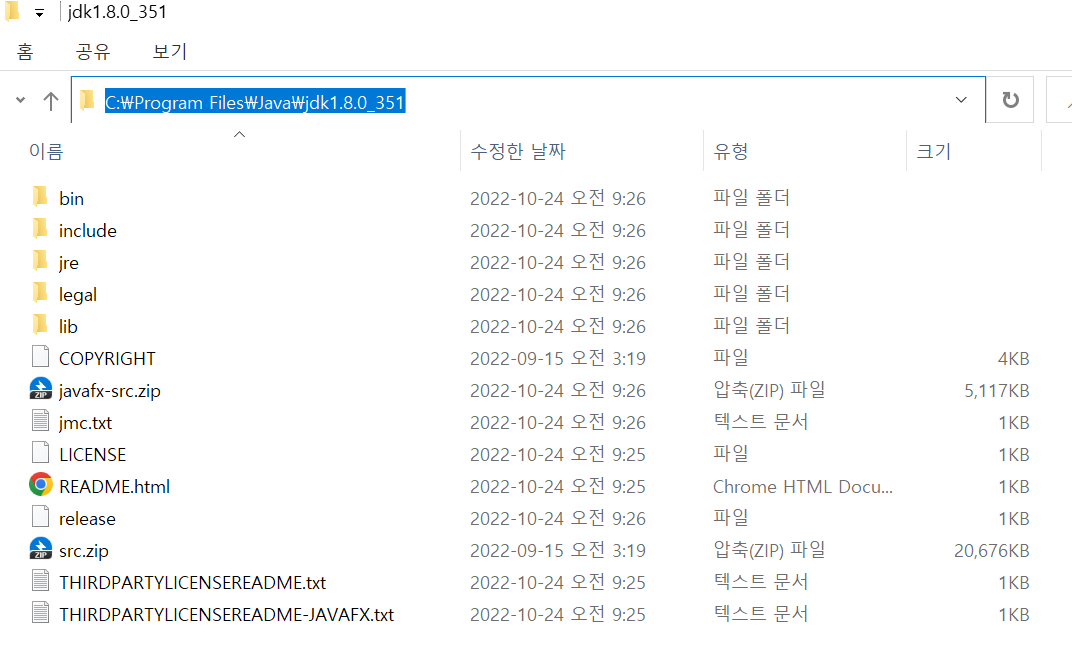 환경변수 설정을 위한 Java 설치 경로를 복사합니다.