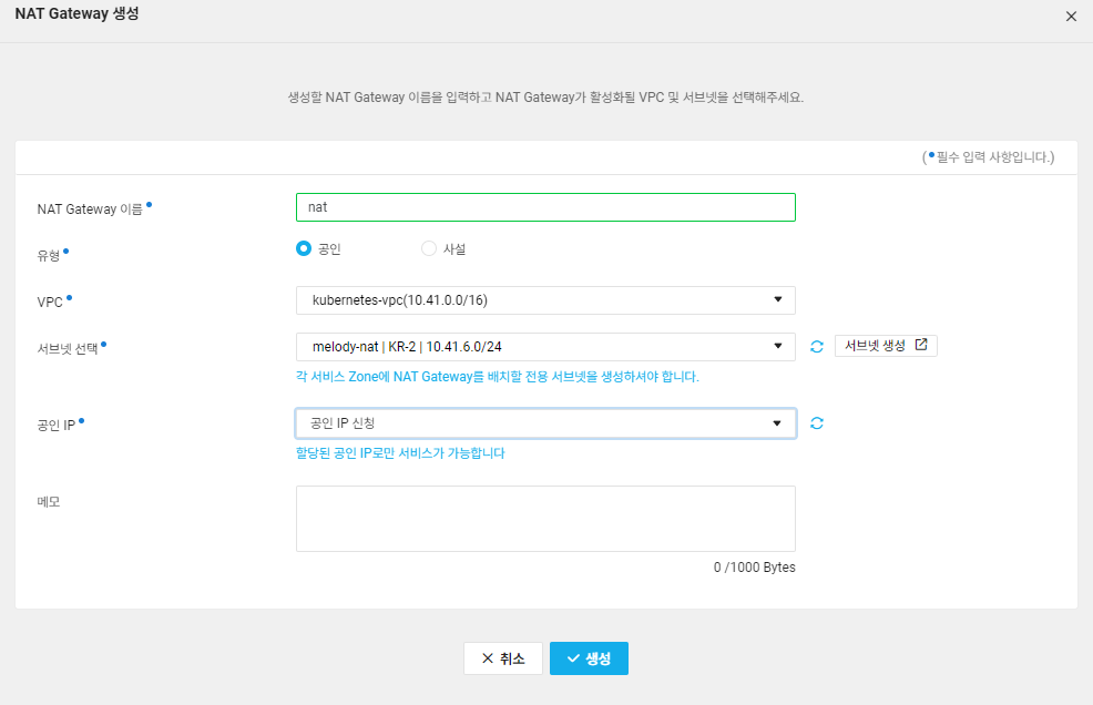 이전에 생성해두었던 VPC와 NAT Gatway전용 subnet을 할당해주면 된다.
