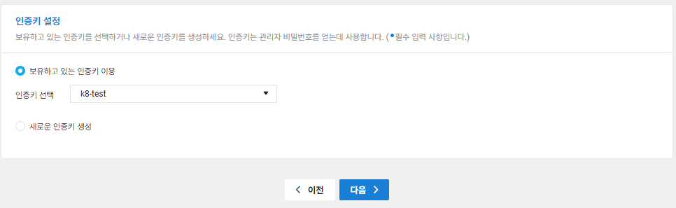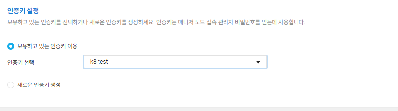 아까 클러스터 생성 시 만들어둔 인증키를 선택해도 괜찮고 서버는 따로 인증키를 사용하고싶다면 생성 후 저장해두자
