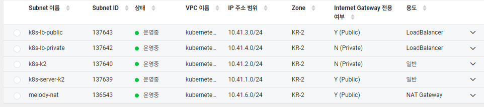 * Internet Gateway 전용여부: kubernetes와 loadbalancer private 외 모두 public