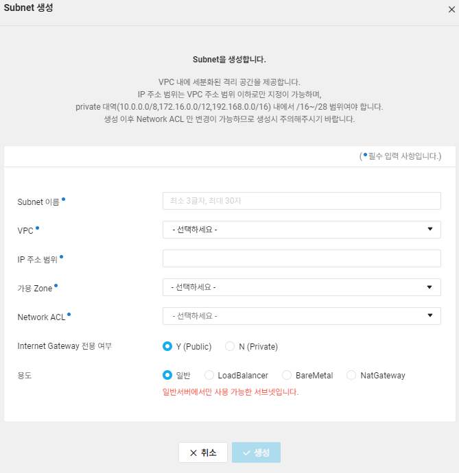Naver Cloud Platform에서 VPC 환경 사용을 위해 VPC 생성하여 서브넷 구성을 해야 한다.