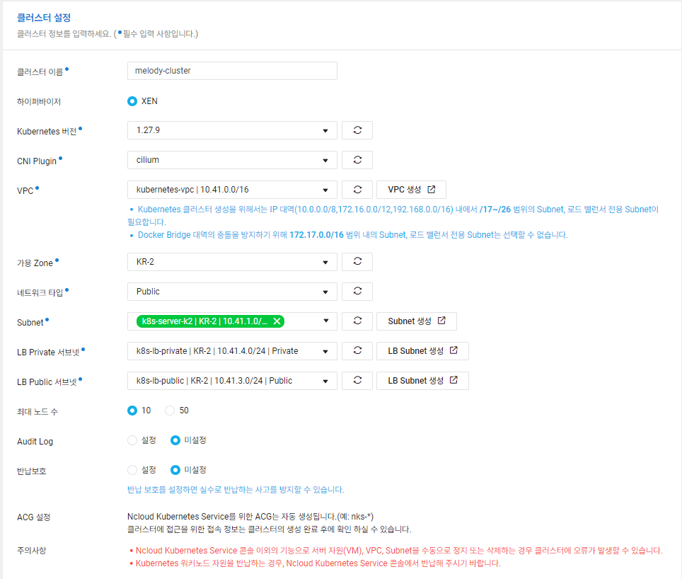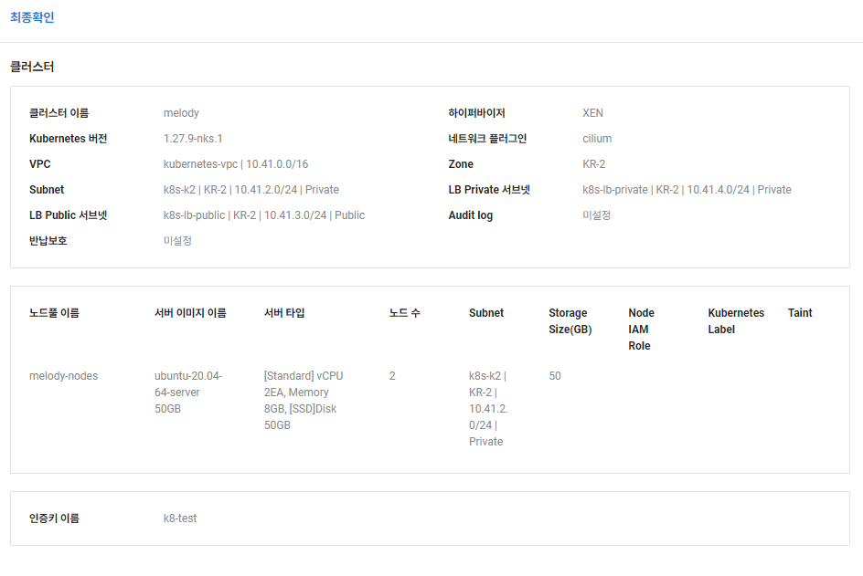 : 쿠버네티스를 편리하게 사용할 수 있도록 NCP에서 제공하는 쿠버네티스 서비스이며 노드는 2개로 구성하고자 한다.