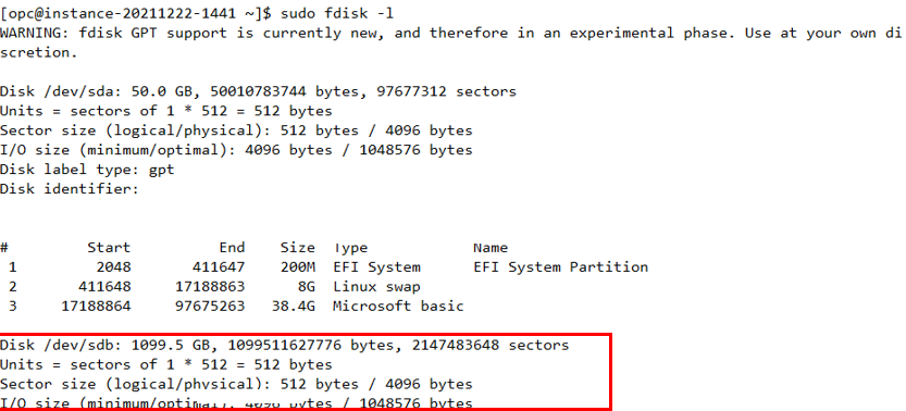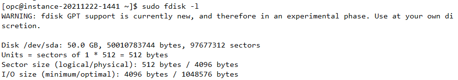 이제 Block Volume을 연결했던 compute instance의 터미널로 접속하여 sudo fdisk -l 커맨드를 입력하면