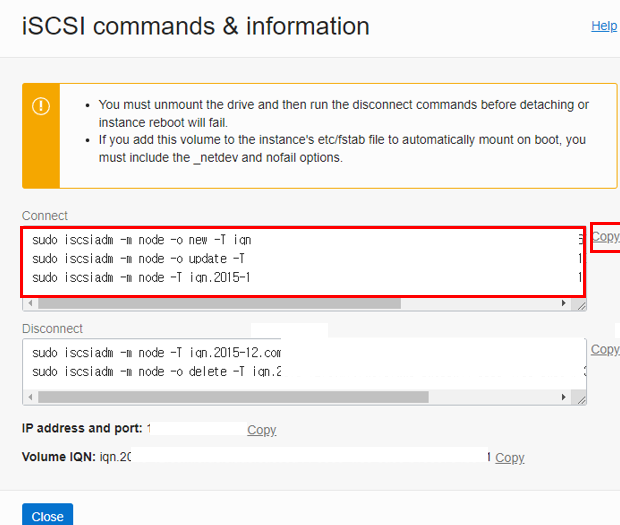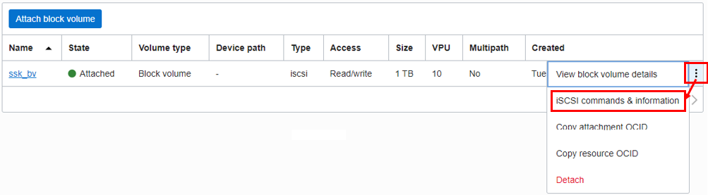 이제 맨 우측에 아이콘을 선택하여 ISCSI commands & information을 눌러 Block Volume을 제거하고 연결하는 커맨드를 확인합니다.