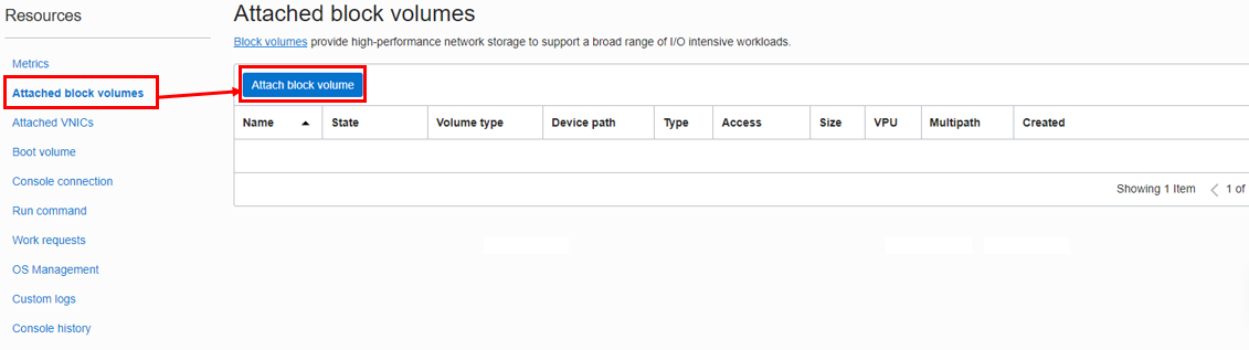 Resource 메뉴에서 Attached block Volumes를 선택하면 위와 같은 화면이 보입니다.