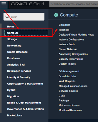 우선 처음으로 Oracle cloud 홈페이지에 접속하여 로그인 한 후 , 위의 사진 처럼 맨 좌측 상단의 아이콘을 누른 후