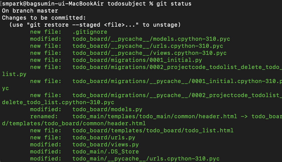 내가 커밋 할 소스파일들 add가 끝났다면, 아래와 같이 어떤 파일들이 변경되었는지, 혹은 삭제 되었는지