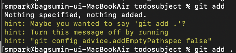 저는 전체파일을 add 하였으며, 아무 입력 없이 git add 명령어를 입력하게 된다면,